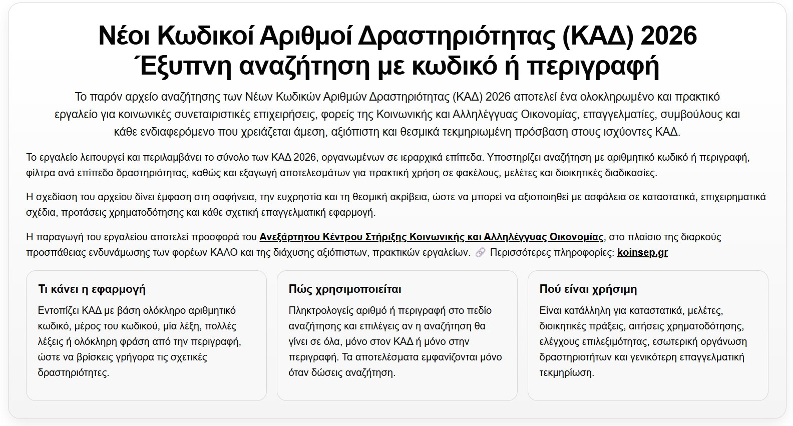 Σε δημόσια διάθεση βρίσκεται πλέον η νέα εφαρμογή αναζήτησης για τους Κωδικούς Αριθμούς Δραστηριότητας (ΚΑΔ) 2026, μια πρακτική και ουσιαστική ψηφιακή παρέμβαση που έρχεται να καλύψει μια καθημερινή, πραγματική και κρίσιμη ανάγκη: την άμεση, αξιόπιστη και λειτουργική αναζήτηση των ισχυόντων ΚΑΔ. {διαβάστε εδώ την συνέχεια}