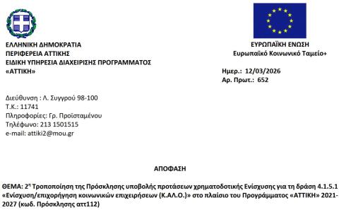 Το έγγραφο αφορά τη 2η τροποποίηση της Πρόσκλησης αττ112 για τη δράση «Ενίσχυση/επιχορήγηση κοινωνικών επιχειρήσεων (Κ.ΑΛ.Ο.)» στο πλαίσιο του Προγράμματος «Αττική 2021–2027». Η απόφαση εκδόθηκε από την Περιφέρεια Αττικής στις 12/03/2026 και έχει ως βασικό σκοπό να ενημερώσει επίσημα τους ενδιαφερόμενους φορείς Κοινωνικής και Αλληλέγγυας Οικονομίας για αλλαγές στην πρόσκληση. {διαβάστε εδώ την συνέχεια}