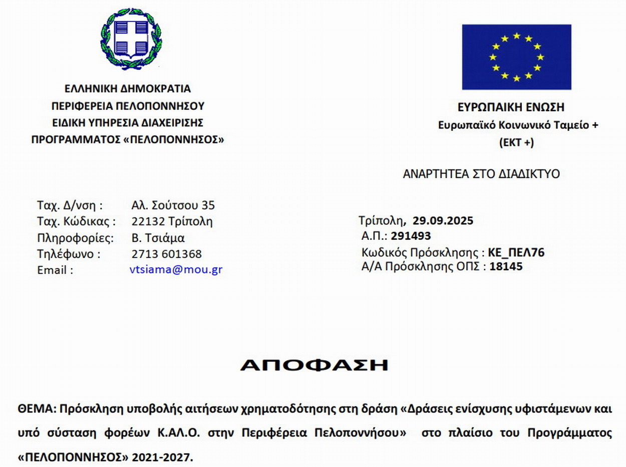 Παράταση έως 16/01/2026 Πρόσκληση Χρηματοδότησης Κ.Αλ.Ο. στην Περιφέρεια Πελοποννήσου – Όλες οι Λεπτομέρειες