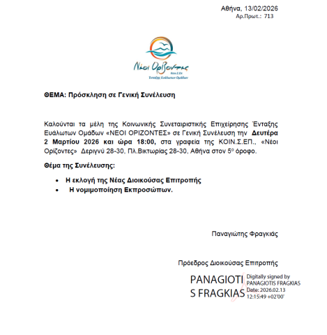 Νέα Φορέων ΚΑΛΟ Ανακοίνωση Παρ, 02/13/2026 - 12:22 "Νέοι Ορίζοντες" Κοιν.Σ.Επ. Ένταξης Ευάλωτων Ομάδων Θέμα της Συνέλευσης η εκλογή της Νέας Διοικούσας Επιτροπής και η Νομιμοποίηση Εκπροσώπων